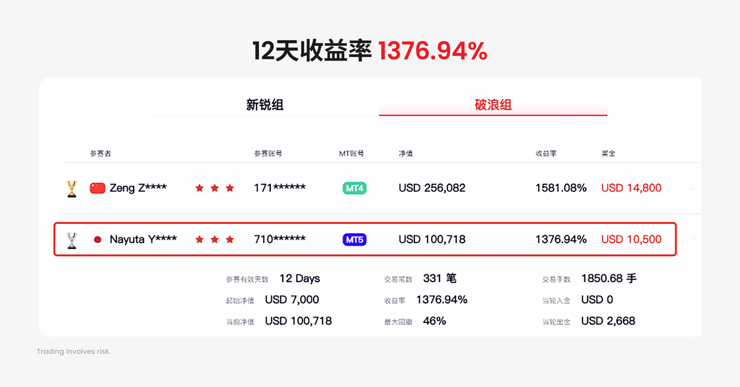 恭喜来自中国的 Trader X 凭借极致的风控与精准的行情捕捉,在总决赛六强对決中获胜,拿下象征最高荣誉的 ¥1,000,000 冠军奖金!