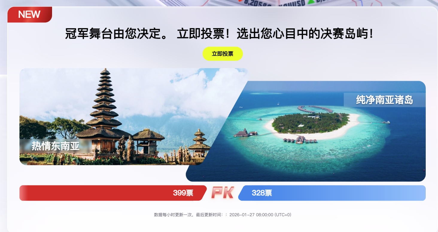 目前投票通道已正式开启,截止时间为 2026 年 1 月 31 日 23:59(UTC+0),届时得票最高的岛屿将成为最终决赛舞台。立即登录活动主页,为心中的理想热带岛屿投出关键一票!