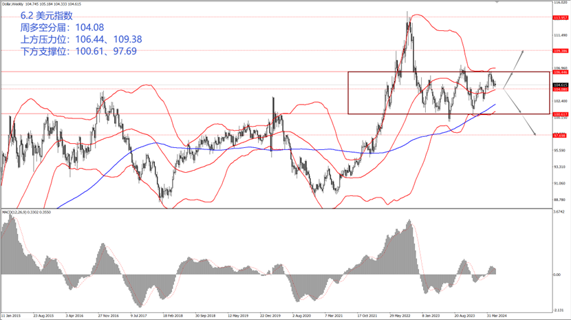- 如果美指运行于 104.08 一线上方,届时则关注区间上边界 106.44 和 109.38 两个位置的压制力度,尤其关注震荡区间上边界 106.44 一线的压制力度;