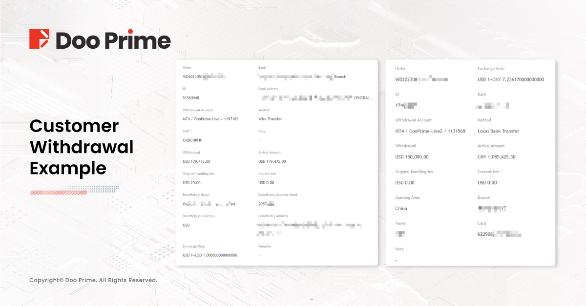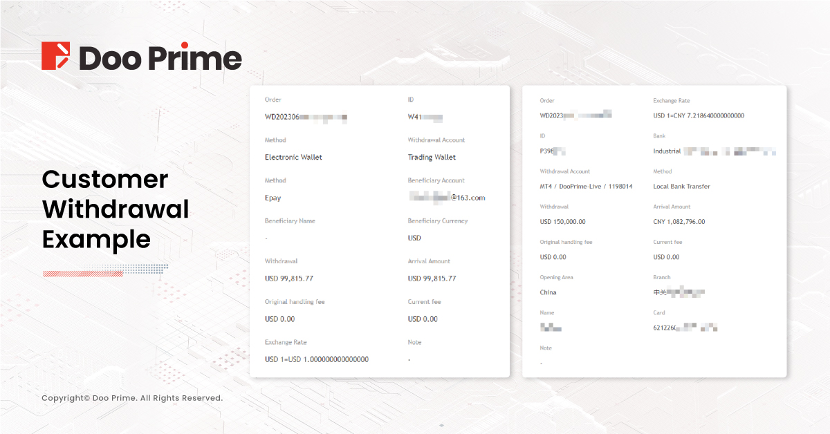 Doo Prime’s clients are able to withdraw funds via our provided funding channels including Local Bank Transfer, International Wire Transfer, and E-Wallet. Recently, from August 14th to August 25th 2023, Doo Prime processed a total of 8,337 withdrawal transactions for clients, with a total amount of USD 21,586,960.34.