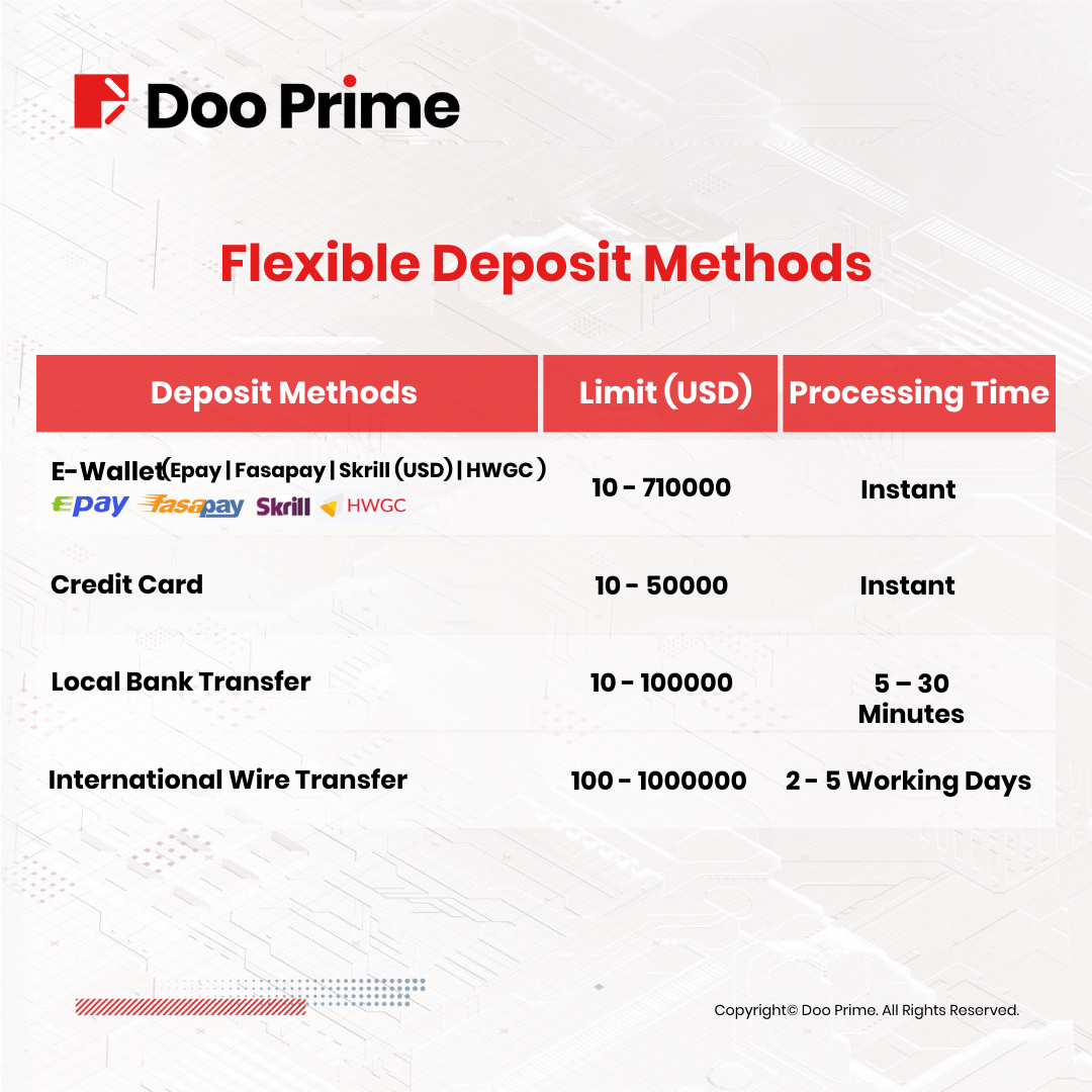 Doo Prime provides a variety of deposit and funding methods including E-Wallet, Credit/Debit Cards, International Wire Transfer, and Local Bank Transfer. As globalization continues to increase, Doo Prime ensures the quickest access to funds by accommodating deposits in various currencies including AED、AUD、BRL、COP、CLP、CNY、EUR、EUSD、GBP、HKD、IDR、KRW、KHR、LAK、MMK、MXN、NGN、PEN、THB、USD、USDT、VND、ZAR, and more.