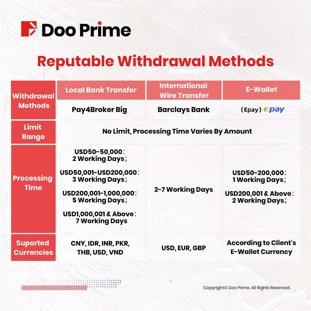 The complexity and diversity of the global financial investment market have prompted investors to constantly adjust and iterate their investment strategies, product choices as well as asset allocation. In order to meet the needs of clients to flexibly adjust funds, Doo Prime provides a variety of efficient and reliable deposit and withdrawal methods.