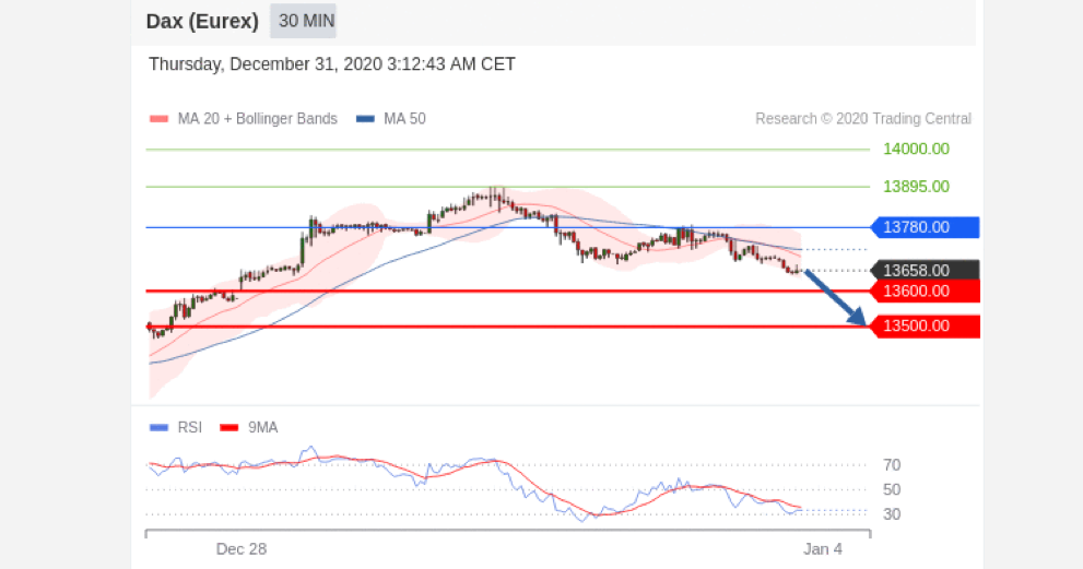 The RSI fallen below 70 on 2020 Dec 30 at 21:00 GMT, telling us the price is starting to pull back from being overbought.