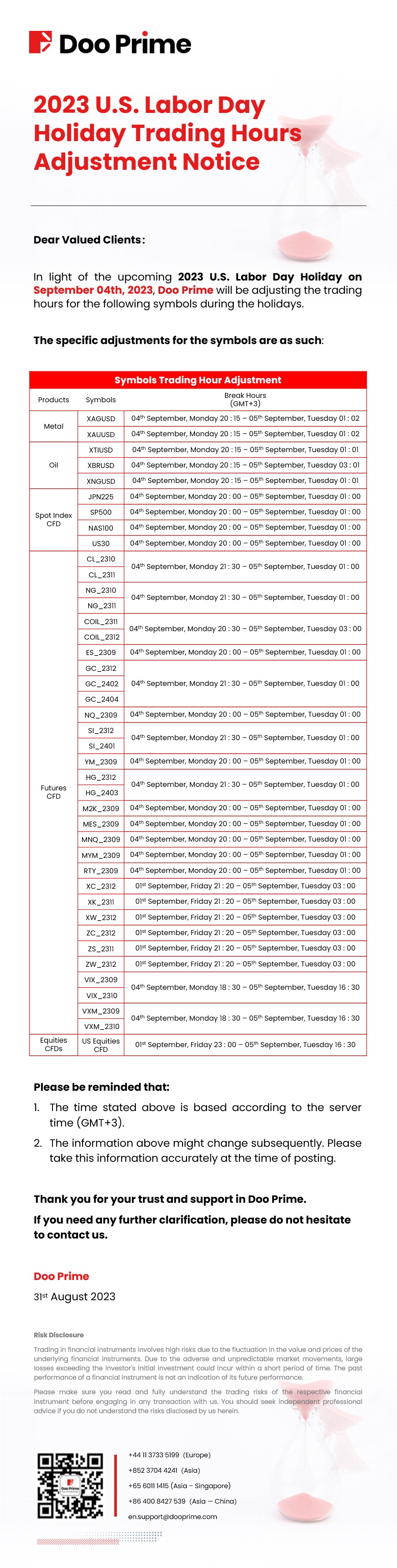 2023-09-01 | Holiday Hours , Trading Hours Adjustment