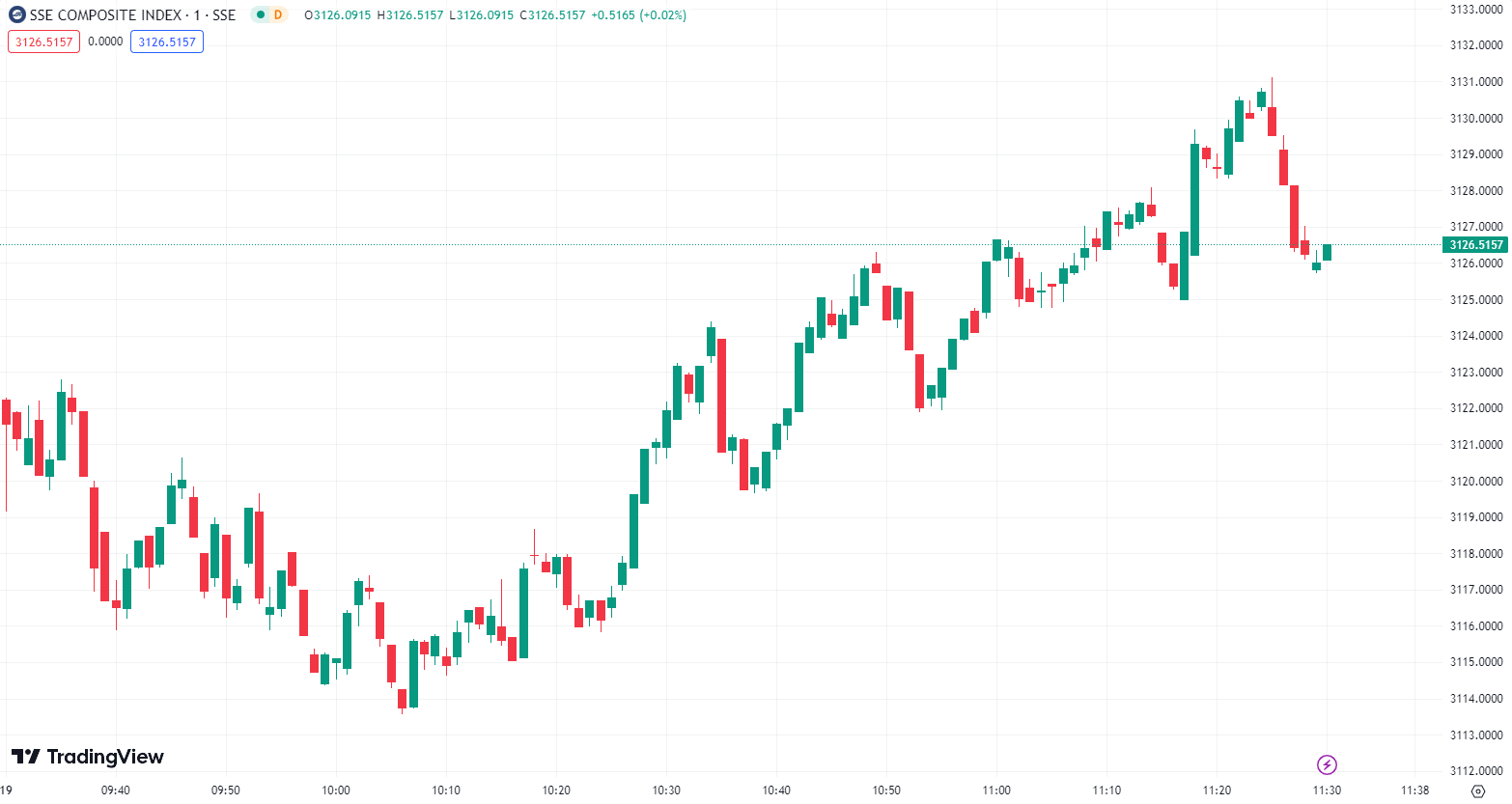 - Shanghai Composite Index (SHCOMP) rose by 0.02%, closing at 3,126.52.