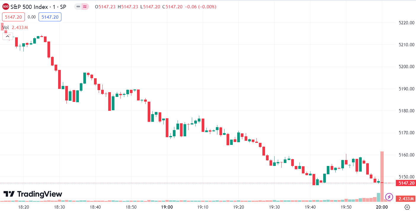- S&P 500 Index declined by 64.28 points, or 1.23%, to 5,147.21.