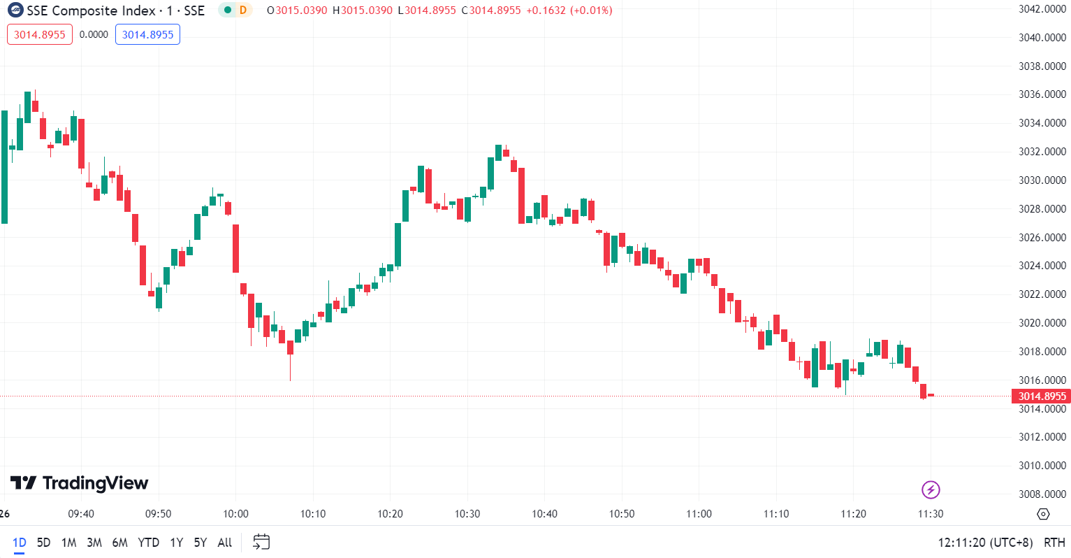 - Shanghai Composite Index (SHCOMP) dropped by 0.38%, closing at 3,014.9.