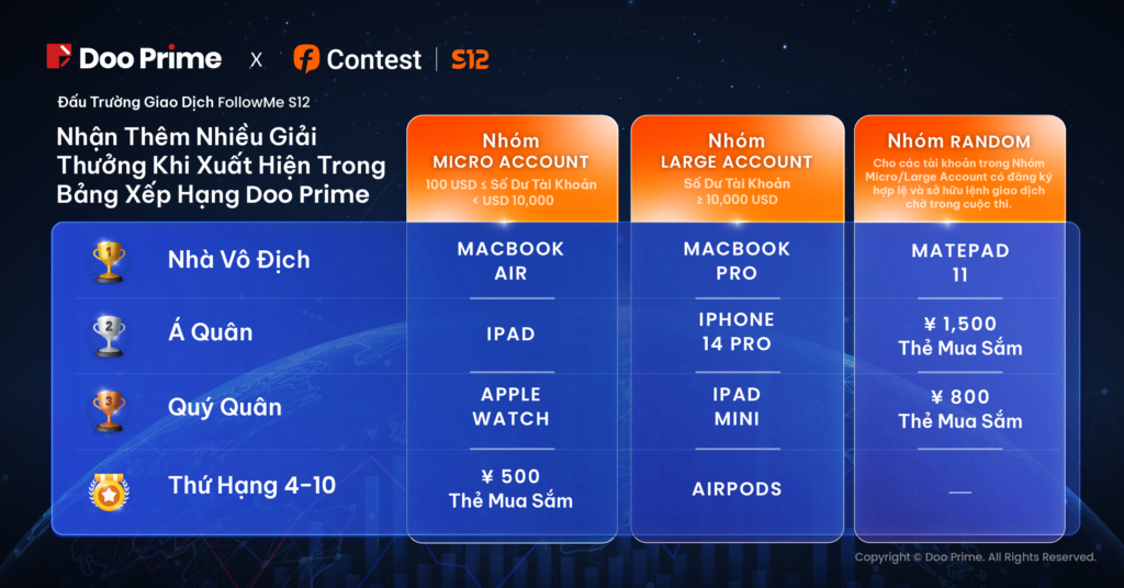 Đặc biệt, những người tạo tài khoản Doo Prime lần đầu thông qua nền tảng FOLLOWME ngay trong khuôn khổ Đấu Trường Giao Dịch FOLLOWME S12 sẽ có cơ hội giành được MacBook Pro, iPhone 14 Pro, iPad mini hoặc các giải thưởng kỹ thuật số 3C hấp dẫn bên cạnh tổng giải thưởng hơn 55,000 USD từ cuộc thi. Chúng tôi rất hy vọng được song hành cùng bạn trên hành trình giao dịch ngay cả trong và sau cuộc thi.