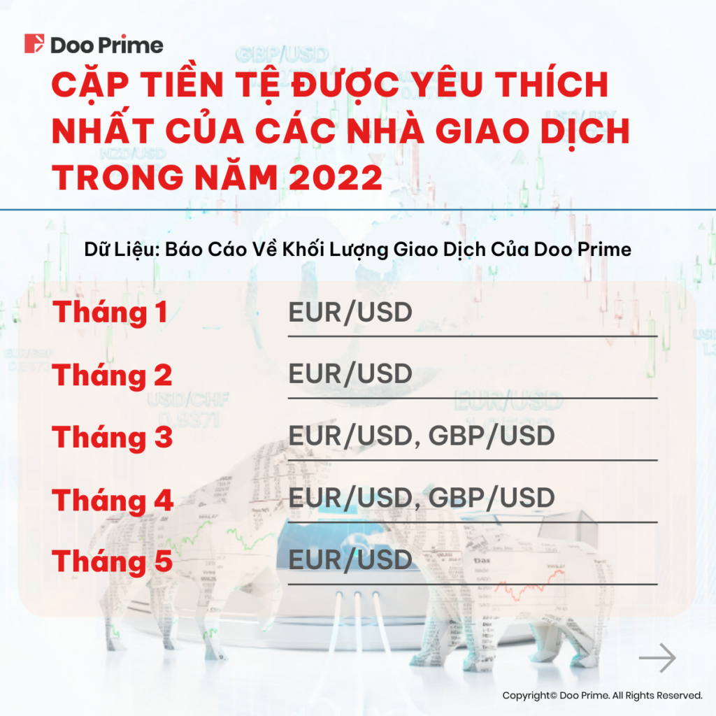 Ngay dưới đây, chúng tôi đã tổng hợp một danh sách các cặp tiền tệ được yêu thích nhất trong năm 2022 dựa trên báo cáo về khối lượng giao dịch của Doo Prime.