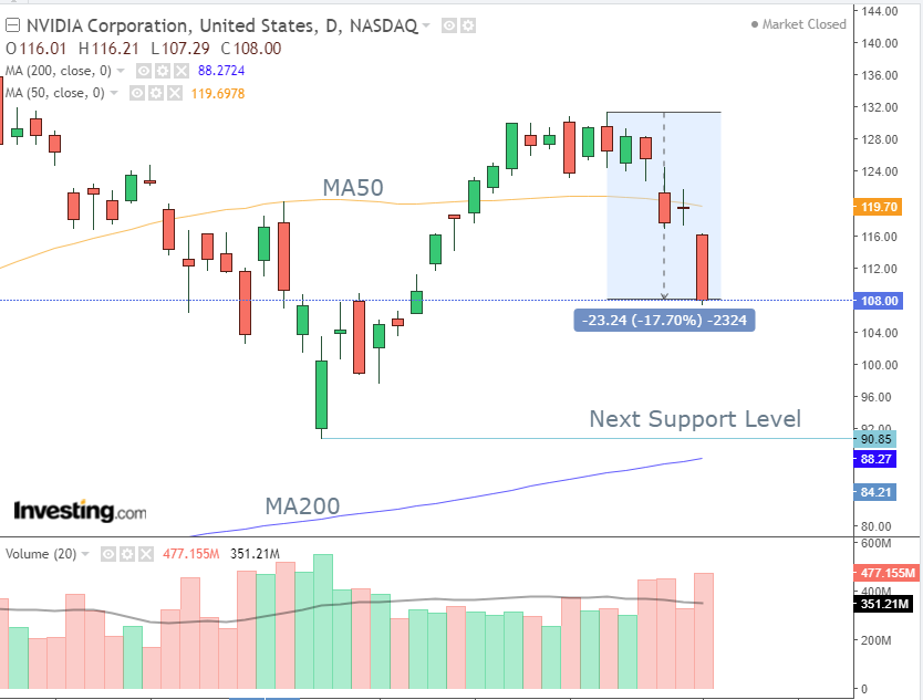 Chỉ trong 5 ngày giao dịch, Nvidia đã rơi tận 17,7% từ đỉnh gần nhất, xuống mức 108 USD cho mỗi cổ phiếu. Chỉ tính trong ngày giao dịch vào thứ Ba tuần này, NVDA đã giảm hơn 9%, tức ông vua ngành chip đã mất khoảng 279 tỷ USD vốn hóa.